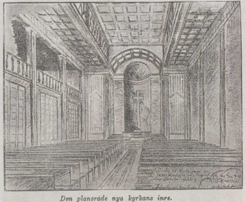 Bilden i sidhuvudet visar den planerade nya kyrkans inre, hämtad ur Göteborgs Handels- och Sjöfartstidning 21 november 1923.