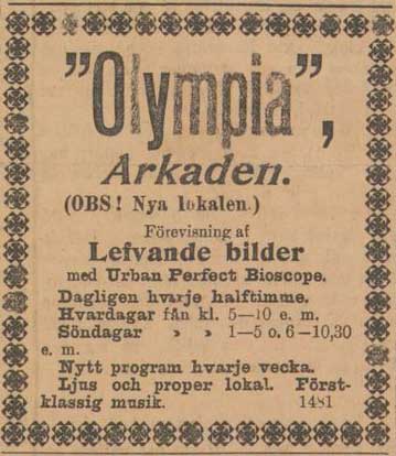 ”’Olympia’ är namnet på en ny lokal för förevisning af kinematografbilder, som i dag öppnas för allmänheten i Arkaden af hr Anders Skog.