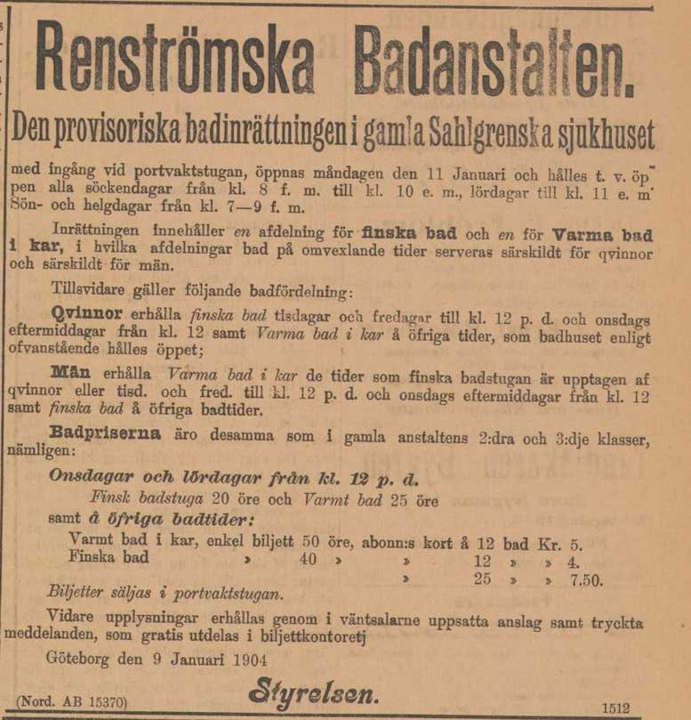 ”Renströmska badanstalten i gamla Sahlgrenska sjukhuset öppnas som bekant i dag för allmänheten.