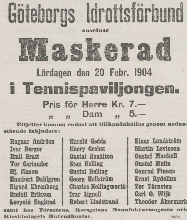 ”I Tennispaviljongen har arbetats med rastlös iver på de storartade förberedelserna för maskeraden, som värkligen lofvar att blifva något ovanligt treflig. Hela den stora tennishallen har med hjälp af granar och spalierer omändrats till tvänne vinterträdgårdar, som upplysas af kulörta lyktor. För öfrigt kommer paviljongen förutom de vanliga elektriska lamporna att upplysas af en »sol» och en »måne» – någon närmare beskrifning inlåta vi oss ej på, då vi äro förbjudna omtala för mycket af hemligheterna, men vi kunna ej låta bli att nämna, att en tidning, »Lysmasken», kommer att utgifvas under kvällens lopp. Den ansvarige utgifvaren känna vi ej, men emedarbetare lära tillhöra stan’s kvickaste pännor.