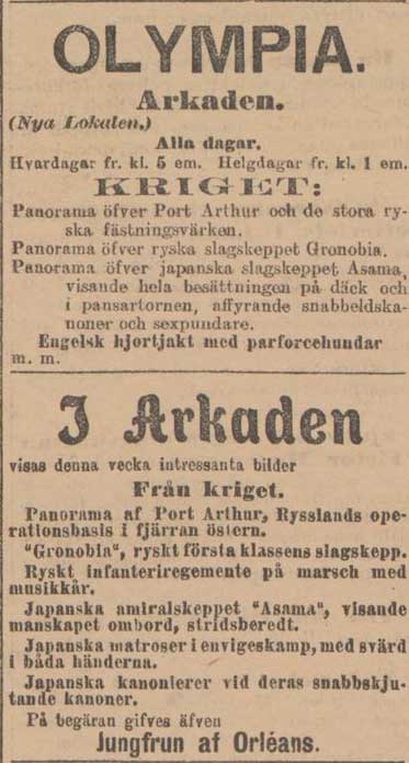 Det avlägsna kriget mellan Ryssland och Japan fyllde dagstidningarna under inledningen av 1904 och stadens invånare följde utvecklingen på ett sätt som inte hade varit möjligt bara några år tidigare. Extraupplagor med kartor över krigsförloppet sålde slut och bildvisningarna i Arkaden och Olympia lockade många.