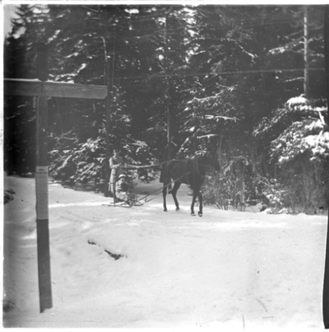 Bilden i sidhuvudet är hämtad från Digitalt museum: Sparkstötting efter häst.” :: 1 kvinna med ev. barn i famnen sitter på en sparkstötting dragen av häst med sele, 1 man står bak på medarna och håller i tömmarna. Snöklädda granar.