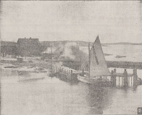 ”Ofvanstående illustration visar de rykande ruinerna efter den i förgår nedbrunna restaurationen på Långedrag. D.v.s. af ruinerna finnas knappast ett spår: allt är nämligen så grundligt nedbrunnet, att man på bilden icke ser annat än en rykande glödhög. Men vid besök på platsen kan man dock se några rester af såväl den gamla som den nyss före olyckan uppförda restaurationsbyggnaden i form af ett par skorstenspipor samt några bärpelare af tegelsten och slutligen lämnar en hop vridna och böjda järnbjälkara f grova dimensioner bevis för eldens häftighet.