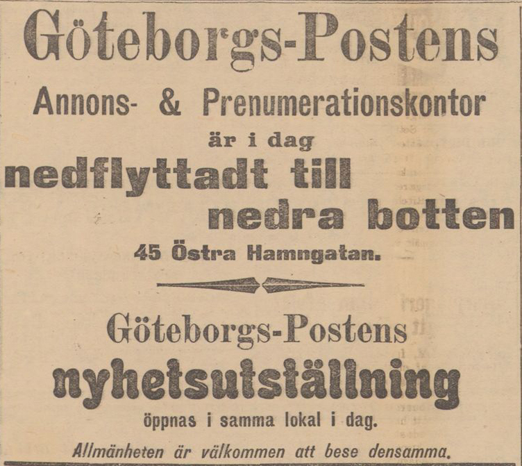 Annonsen i sidhuvudet är hämtad ur Göteborgs-Posten 7 maj 1904.