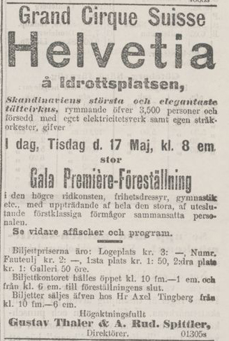 ”Det bör ju vara rätt originellt för de storstadsmässige göteborgarne att behöfva krypa in i ett tält för att beskåda cirkusföreställningar. En hel del hade dock funnits sig i ett dylikt provisorium och inställt sig till ’Grand cirque suisse Helvetia’s’ premiär i går på Idrottsplatsen. Icke något af de cirkusnummer man fick se var under det genomsnittliga och publikens bifallsyttringar föreföllo också vara fullständigt spontana. Sådana presstationer som den af dir. och fru Thaler och fröken Corradiniridna jeu de barre, Texas voltige, den dubbla högre skolan eller ’frihets-dressyr-potpourit’ skulle mycket väl ha kunnat försvara sin plats äfven i mera kontinentalt iscensatta cirkusföreställningar, än nu ifrågakommande.