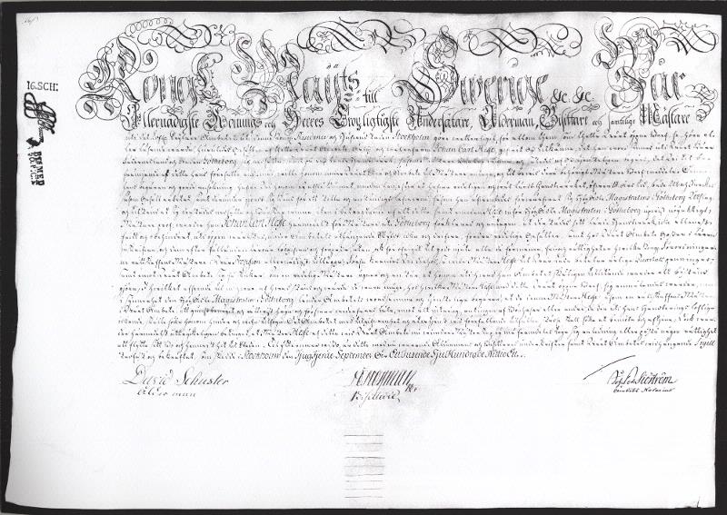 I sidhuvudet visas mästarbrev å pergament utfärdat den 24/9 1791 för Repslagarmästare Johan Carl Hesse. Hämtat från Göteborgs stadsmuseum, Carlotta.