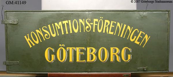 Bilden i sidhuvudet visar en skylt, ”Konsumtions-föreningen Göteborg”, hämtad från Göteborgs stadsmuseum, Carlotta.