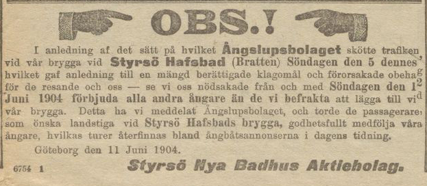 ’I anledning af det sätt på hvilket ångslupsbolaget skötte trafiken vid vår brygga vid Styrsö hafsbad (Bratten) söndagen den 5 dennes, hvilket gaf anledning till en mängd berättigade klagomål och förorsakade obehag för de resande och oss – se vi oss nödsakade från och med söndagen den 12 juni 1904 förbjuda alla andra ångare än de vi befrakta att lägga till vid vår brygga. Detta ha vi meddelat ångslupsbolaget, och torde de passagerare, som önska landstiga vid Styrsö hafsbads brygga, godhetsfullt medfölja våra ångare, hvilkas turer återfinns bland ångbåtsannonserna i dagens tidning.’