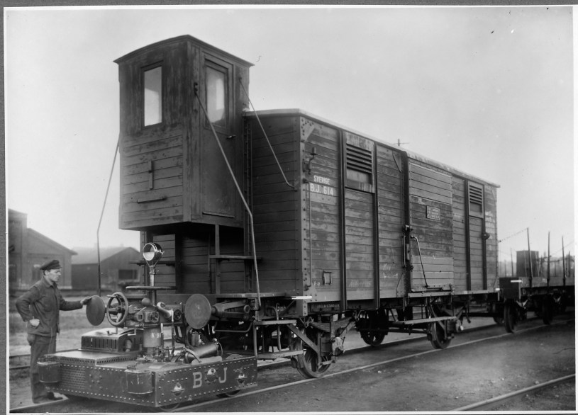 Bilden i sidhuvudet visar Bergslagernas Järnvägar, BJ Gmh 614, godsvagn med styrhytt samt en mini lokomotor BJ Zml. Hämtat från Digitalt museum.