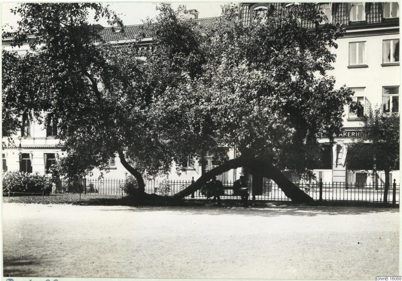 Bilden i sidhuvudet är från 1920 och visar Domkyrkoplan med en kullblåst poppel som tjänar som skydd för solen för 2 män på bänk under trädet. Hämtad från Göteborgs stadsmueum, Carlotta.