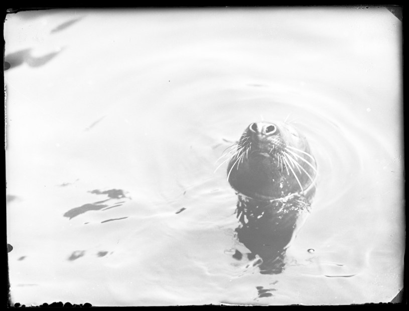 Bilden i sidhuvudet visar en gråsäl tittar upp från vattnet i Säldammen i Slottskogen. Hämtad från Digitalt museum.