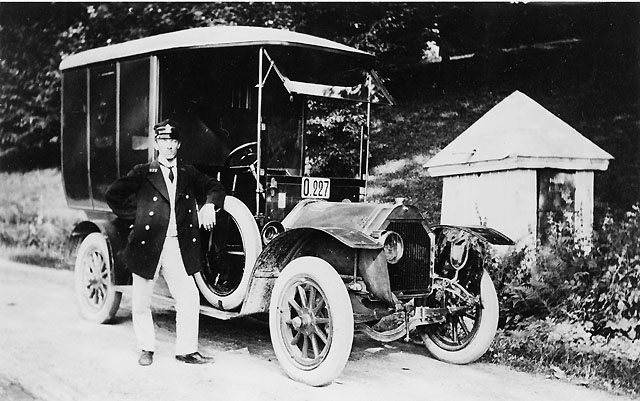 Bilden i sidhuvudet visar postutväxlingen i Jonsered i samband med Jonseredsraset den 14.6.1913, då banvallen rasade. Chaufför är epj Josef Carlsson, från Göteborg 1. Bilens reg.nr O227. Hämtad från Digitalt museum.