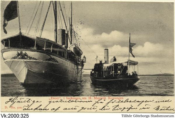 Bilden i sidhuvudet visar ”Drott”, i barkassen ses H. Majestät Konungen. Vykort stämplat 1907. Hämtat från Göteborgs stadsmuseum, Carlotta.