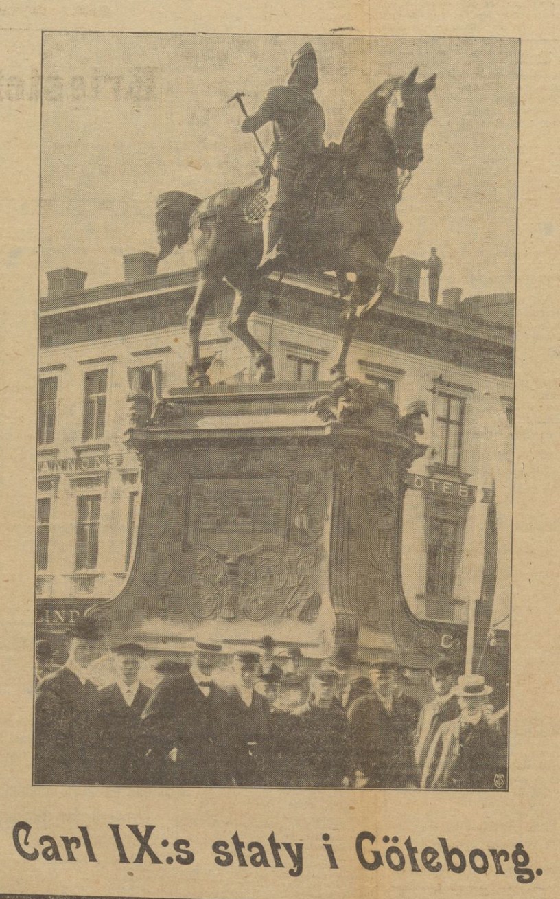 Bilden i sidhuvudet visar den nya statyn, bilden är hämtad ur Göteborgs Aftonblad 8 september 1904.