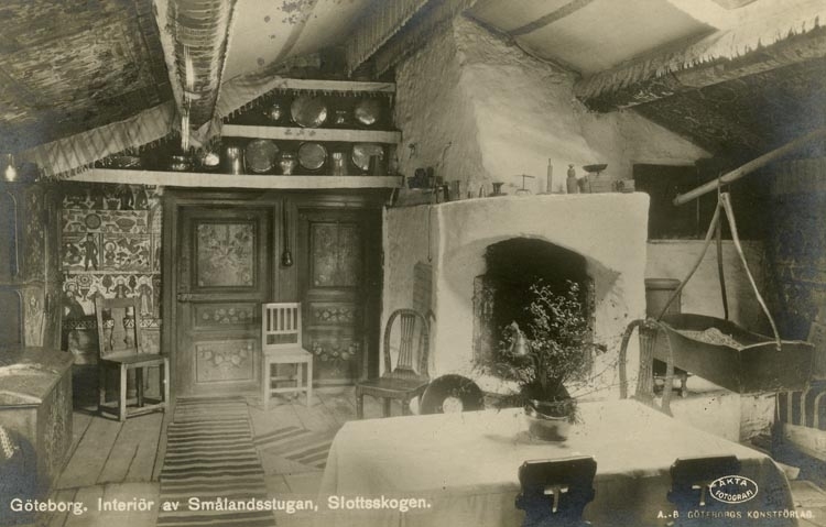 Bilden i sidhuvudet visar en interiör av Smålandsstugan, Slottsskogen, hämtad från Digitalt museum.