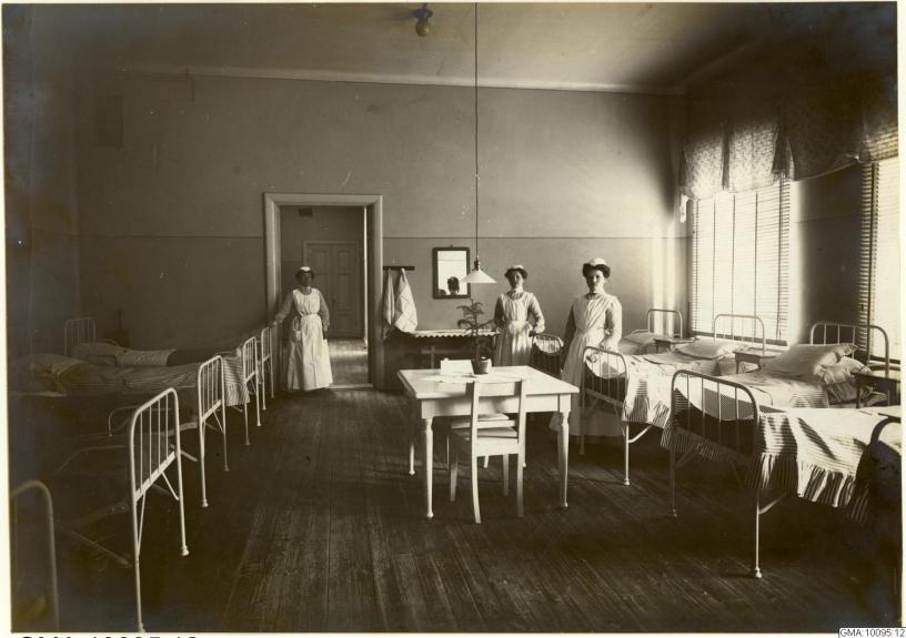 Bilden i sidhuvudet visar ”Öfvervakningssal” med 3 sjuksköterskor på Sankt jörgens sjukhus. Hämtad från Göteborgs stadsmuseum, Carlotta.