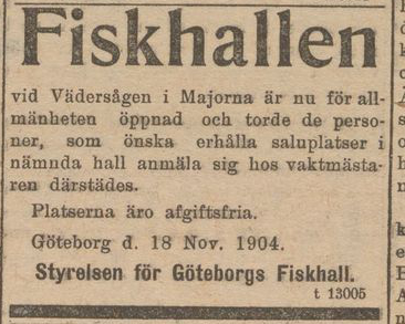 ”Den nya fiskhallen vid Vädersågen i Majorna är nu färdig och skall i morgon upplåtas för fiskförsäljning. Den är uppförd af trä och är 30 meter lång och 12 meter bred. Å sidorna äro anbrakta stora skjutdörrar, som vid vackert väder komma att vara öppna. Från stora fönster i taket strömmar dagsljuset rikligt in. Efter mörkrets inbrott upplyses hallen af elektriska båglampor. Det cementerade golfvet är uppdeladt i 47 rutor om ett par kvm. Hvar, på hvilka fiskare och fiskhandlare få placera sina backar och bord. För att fiskebåtar i tillräcklig mängd skolla kunna lägga till hamnen utanför fiskhallen – f.d. segelsällskapets båthamn – har man vidtagit omfattande åtgärder. Hamnen har uppmuddrats och en brygga till en längd af 70 m. har uppförts. Belysningen i hamnen och på planen framför hallen fås från sex båglampor.