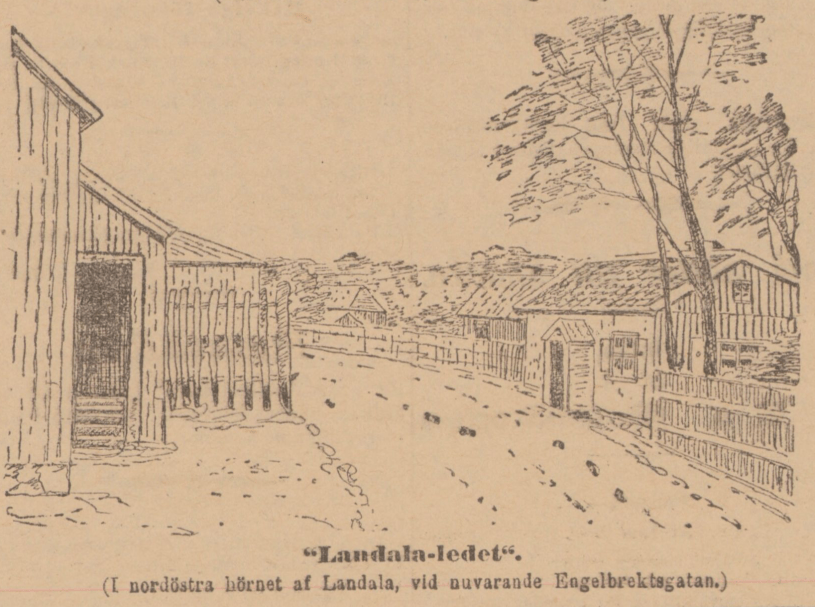 Bilden i sidhuvudet visar ”Landala-ledet” i nordöstra hörnet av Landala, vid nuvarande Engelbrektsgatan. Hämtad ur Göteborgs-Posten 14 januari 1905.