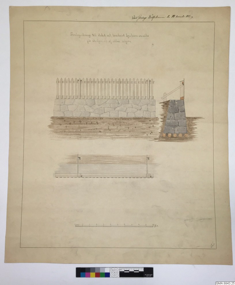 Bilden i sidhuvudet visar ritning, ”Förslagsritning till staket vid landeriet Lyckans område för utvidgning af södra svägen”, hämtad från Göteborgs stadsmuseum, Carlotta.