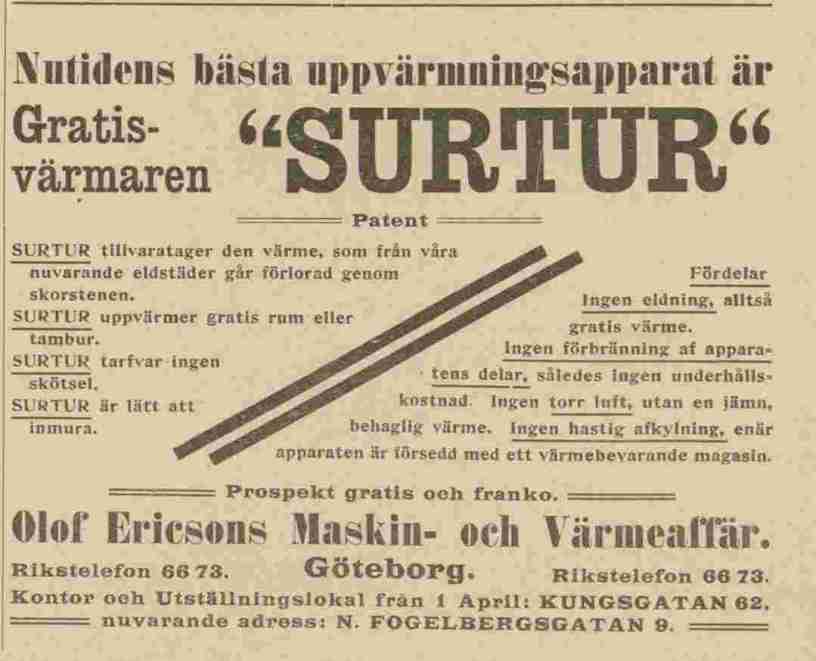 Surtur sättes nämligen i förbindelse med hvilken som hälst rökkanal i huset oh uppvärmes af den därifrån kommande varma röken. Särskildt ändamålsenlig har apparaten vid de under två år med densamma anställda försöken visat sig vara, när den placeras intill den från köksspiseln ledande rökkanalen för uppvärmninga af något rum i samma eller ofvanför belägen bostad, emedan det ju dagligen i hushållen eldas i köksspiseln. Surtur säges därjämte förträffligt reglera draget i spiseln och kan således ej oväsentligt inbespara bränsleförbrukningen i denna. Apparaten, som uppvärmer äfven större rum eller tamburer, lämnar en jämn och behaglig värme samt kräfver hvarken skötsel eller underhållskostnad. Det billiga pris, den betingar, bör därjämte bidraga till ett allmännare användande af denna gratisuppvärmare. Apparaten försäljes härstädes af Olof Ericsons maskin- och värmeaffär.” (Ur: Göteborgs-Posten 23 februari 1905)
