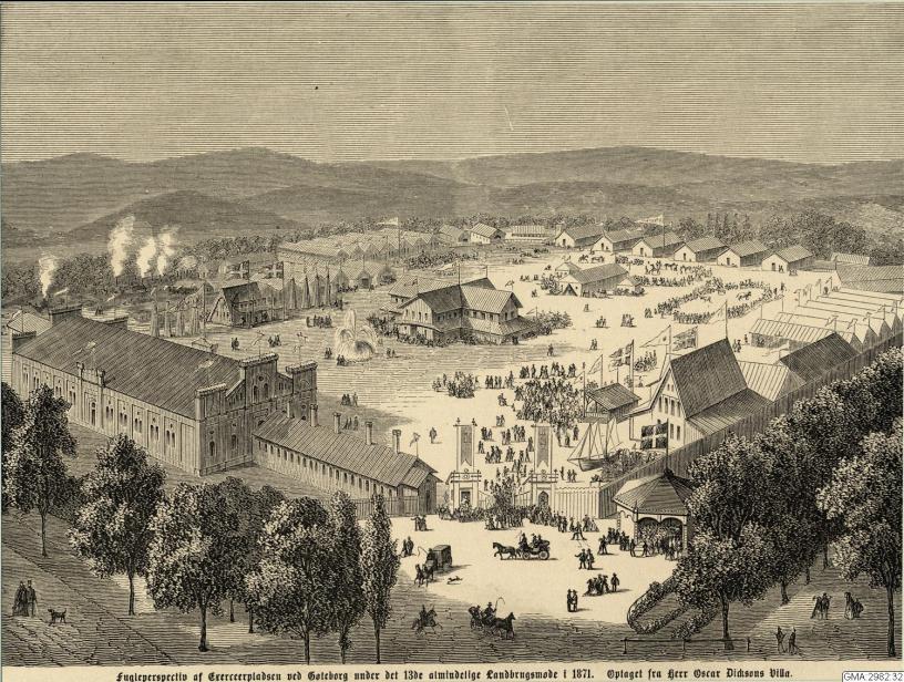 Bilden i sidhuvudet visar ett fågelperspektiv över Heden under Lantbruksmötet 1871. Blick mot söder, med Exercishuset och Gamla Allén i förgrunden. Hämtad från Göteborgs stadsmuseum, Carlotta.