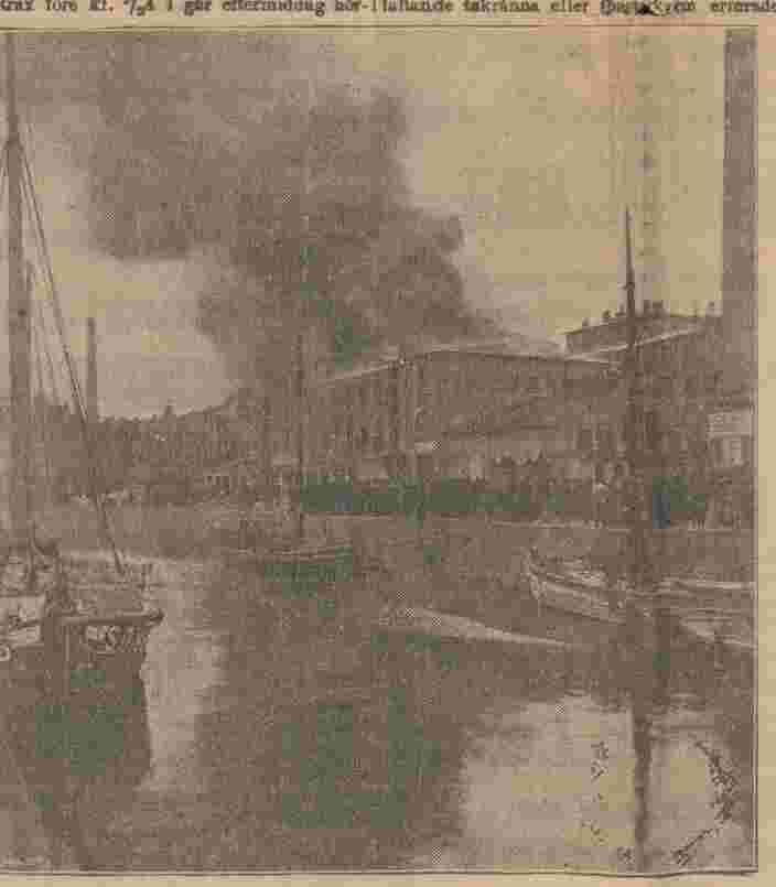 Bilden i sidhuvudet visar ett tidigt skede av branden, hämtad från Göteborgs-Posten 28 mars 1905.