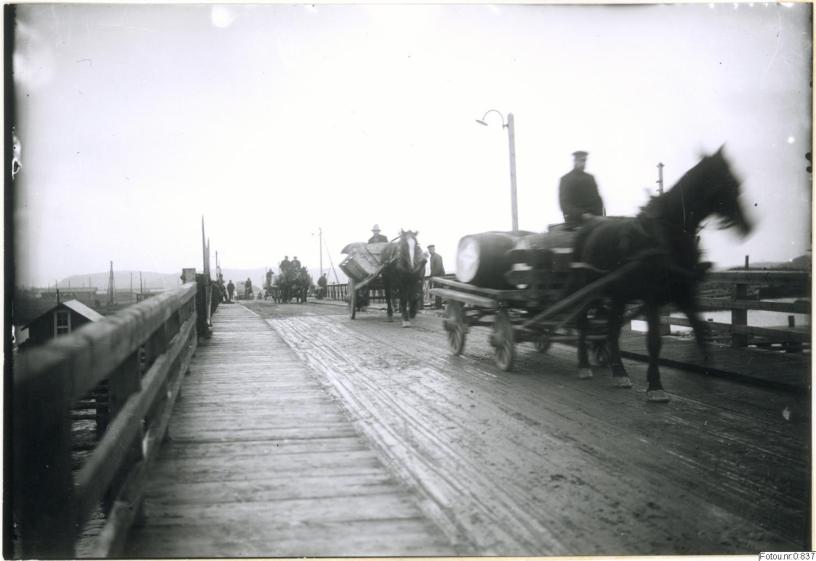 Bilden i sidhuvudet visar hästar med vagnar på väg över Hisingsbron 1915. Hämtad från Göteborgs stadsmuseum, Carlotta.