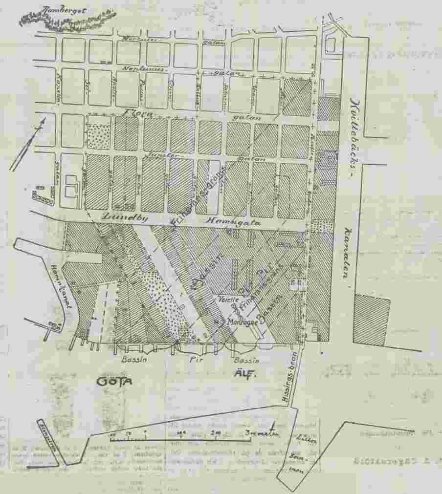 ”Ofvanstående kartskiss visar dels de föreslagna tomtinköpen på norra älfstranden för utvidgande af hamnen, dels inom prickade linier en approximativ frihamnsanordning med en större bassin.