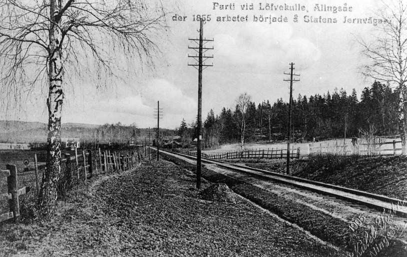 ”Sträckan Alingsås–Göteborg byggdes som bekant först af alla stadsbanelinierna. Vid Skafveryds egendom nära Alingsås samlades den 30 april 1855 en trupp arbetare under ledning a fingeniören Carl Adelsköld, kapten Westman och landtmätaren Sahlbom. Den förstnämnde satte den första staken i marken, och de andra togo de första spadtagen på linien. Den rallare, som körde bort den första kärran med jord, hette Per Skog och lefver ännu i Alingsås.