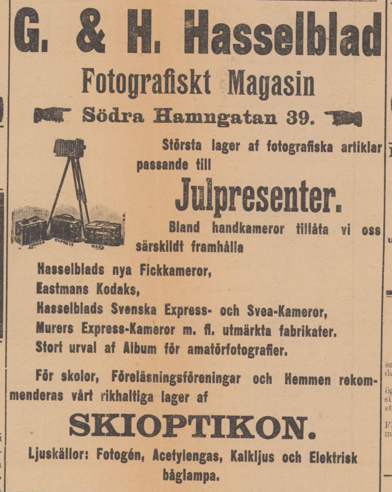 Annonsen i sidhuvudet (och nedan) visar G. & H. Hasselblads annons inför julen 1905, hämtad ur Göteborgs Morgonpost 20 december 1905.