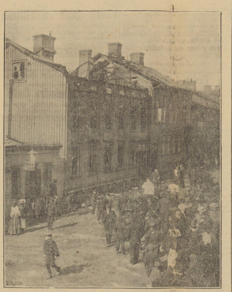 Då brandkåren under ledning af sin chef efter få minuters förlopp inträffade å platsen, hade öfre delen af hr E. Losmans intilliggande hus också fattat eld och börjat brinna med god fart. Bärgning af lösegendomen i denna byggnad, som var bebodd, utom af hr Losman, af tullvaktmästaren Olsson och värkmästaren hos Bark & Warburg hr Karlsson, pågick som allra bäst.