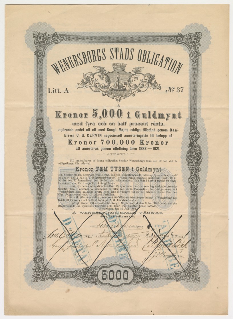 Bilden i sidhuvudet visar en obligation på 5000 kronor, från Vänersborg, hämtad från Digitalt museum.