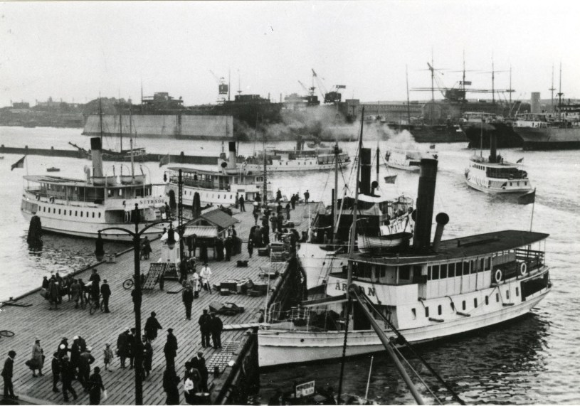 Bilden i sidhuvudet visar träpiren i Göteborg omkring 1940 med passagerarångfartyget ”Ärlan” t.h. i förgrunden, t.v. passagerarångfartyget ”Styrsö II”. Hämtad från Digitalt museum.