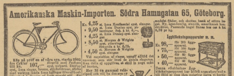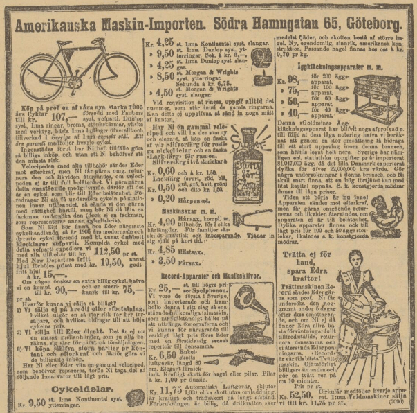 Den som 1905 ville köpa tekniska prylar, importerade från Amerika, kunde bege sig till Amerikanska Maskin-Importen, Södra Hamngatan 65. Annons hämtad ur Göteborgs-Posten 10 juni 1905.