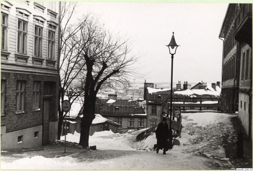 Bilden i sidhuvudet visar Skepparegatan norrut, som korsar Kyrkoliden, foto omkring 1940-43, hämtat från Göteborgs stadsmuseum, Carlotta.