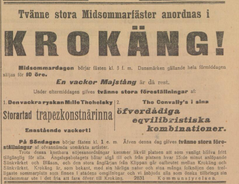 Midsommaren 1905 kunde göteborgarna bege sig till Krokäng på Hisingen för att fira midsommar, två stor fester planerades med dans, rysk trapezkonstnärinna – öfverdådiga eqvilibristiska kombinationer(!)