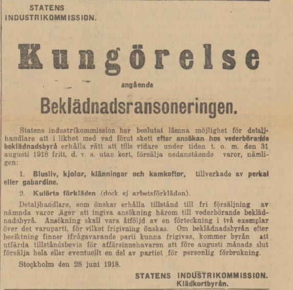 ”Detaljhandlare kunna efter ansökan hos vederbörande beklädnadsbyrå erhålla rätt att under tiden t.o.m. 31 augusti utan kort försälja blusliv, kjolar, klänningar och komkoftor, tillverkade av peskal eller gabardine, samt kulörta förkläden, dock ej arbetsförkläden.” (Ur: Göteborgs-Posten 2 juli 1918)