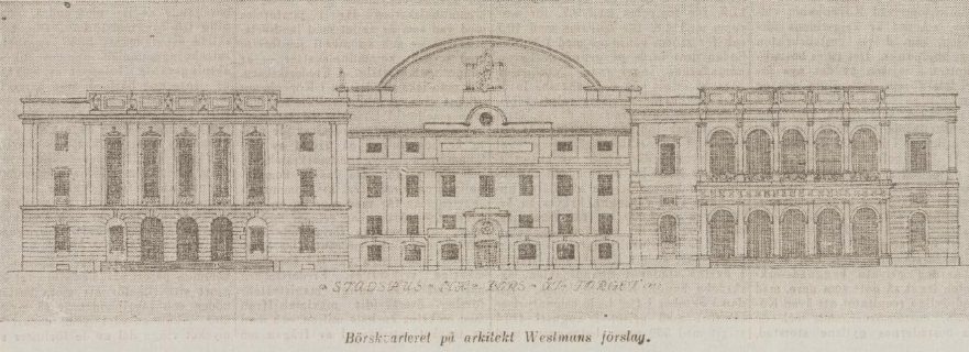 Arkitekt Westman har bibehållit Börsens, högvaktens och rådhusets fasader mot torget samt utbildat övriga fasader självständigt, men i arkitektonisk anslutning till de förra, varjämte gamla högvakten försetts med en påbyggnad. Hörnet mellan Torg- och Köpmansgatorna har utfyllts med en låg och bred tornbyggnad. Torggatans begränsning har skett med användande av låga stenbarriärer och popplar samt rader av lågväxande klippta träd. I sydvästra hörnet markeras torgets huvudentré med en ganska framträdande portalbyggnad. Ett förslag, som de sakkunnige finna beaktansvärt, är att broarna över Stora hamnkanalen tänkas byggda i sen efter förebild av 1700-talets välvda träbroar. Förslaget har i börskvarteret beretts avsevärda utrymmen och har en mycket förtjänstfull behandling av rådhuskvarteret. Här anordnas en andra öppen gård, vilken liksom den nuvarande tänkes glasbetäckt.