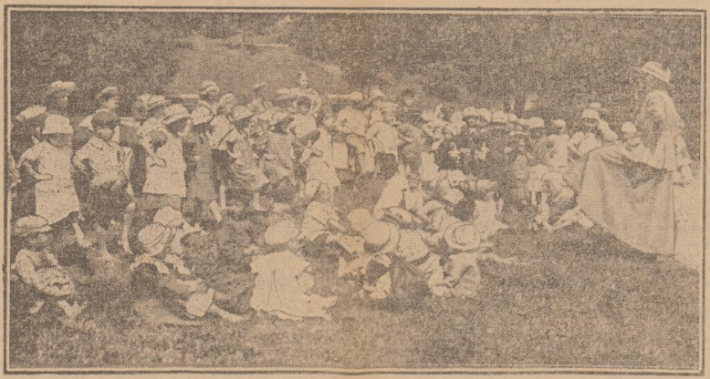 Bilden i sidhuvudet visar en grupp barn under parktantens ledning, hämtad ur Göteborgs-Posten 6 juli 1918.