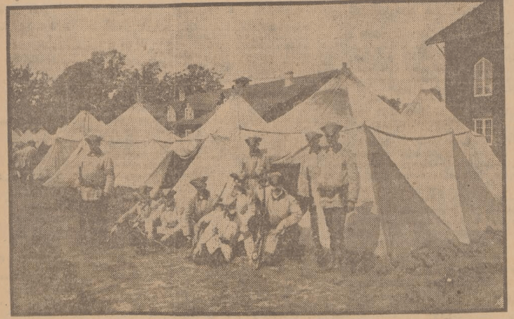 Bilden i sidhuvudet visar en rast framför tälten, hämtad ur Göteborgs Aftonblad 27 juli 1918.
