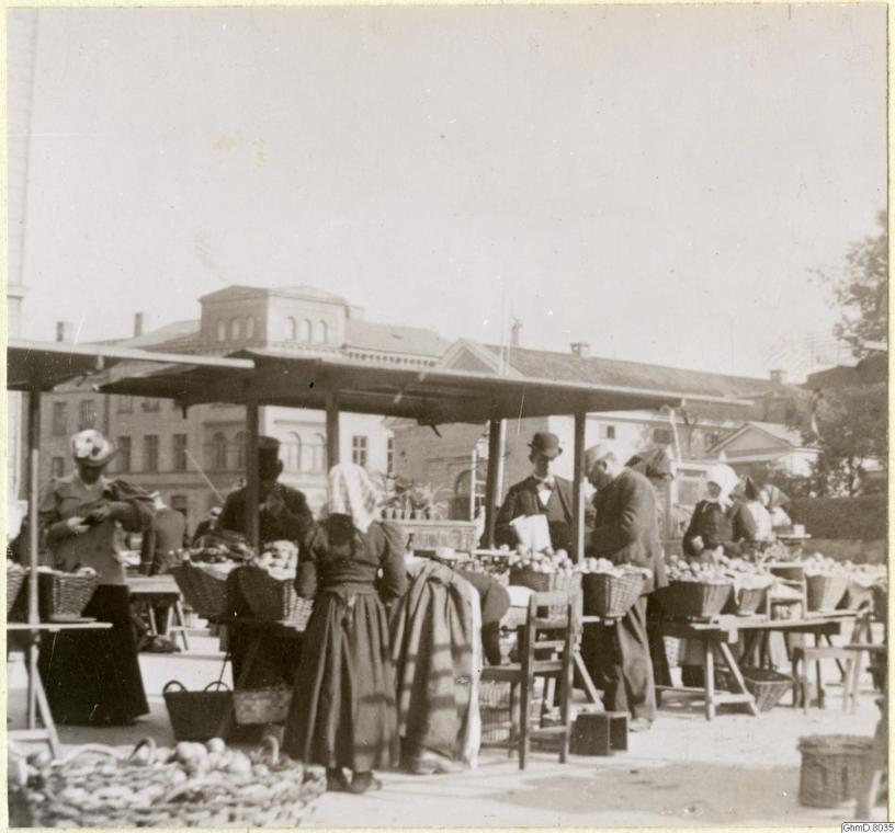 Bilden i sidhuvudet visar en marknadsdag vid Grönsakstorget under 1800-talets slut. Hämtad från Göteborgs stadsmuseum, Carlotta.