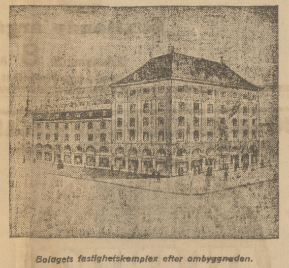 Bilden i sidhuvudet visar bolagets fastighetskomplex efter ombyggnaden, hämtad ur Göteborgs-Posten 6 september 1918.