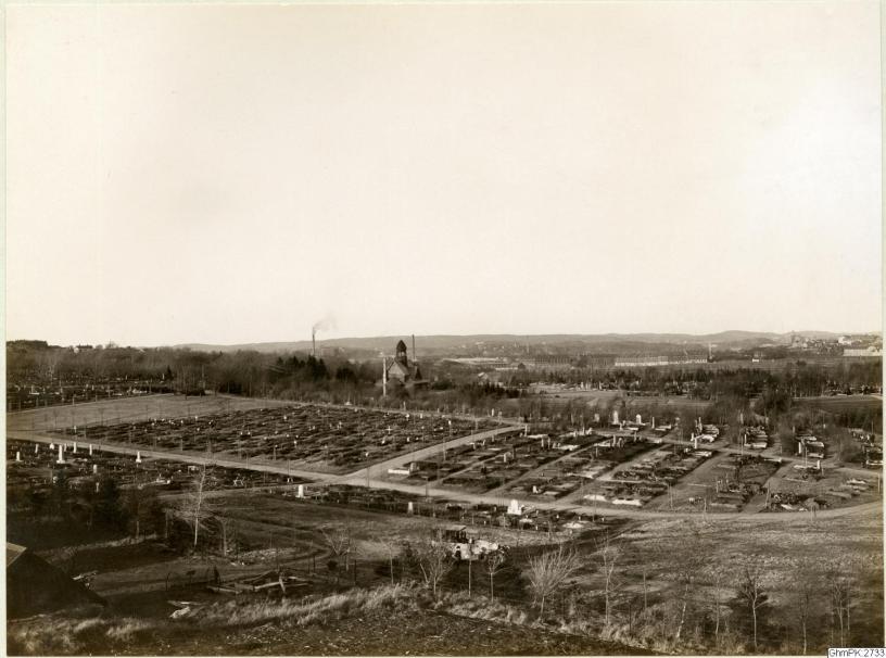 Bilden i sidhuvudet visar en vy över Västra kyrkogården mot nordost. I fonden, mitt i bild kapellet och till höger Kungsladugård år 1915. Hämtad från Göteborgs stadsmuseum, Carlotta.
