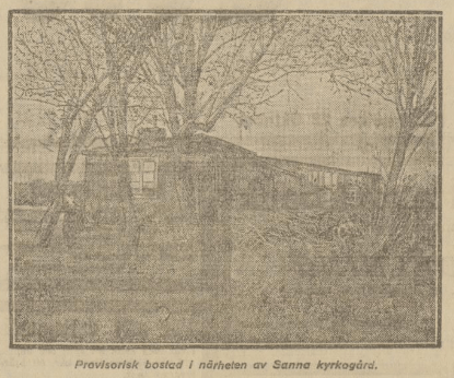Bilden i sidhuvudet visar en provisorisk bostad i närheten av Sanna kyrkogård, hämtad ur Göteborgs-Posten 22 oktober 1918.