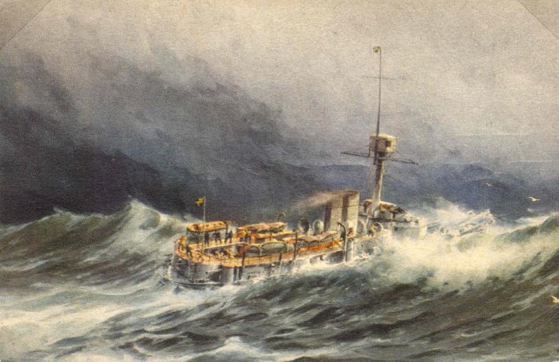 Bilden i sidhuvudet visar pansarbåten Göta i storm på Nordsjön, oljemålning av Herman af Sillén, hämtad från Digitalt museum.