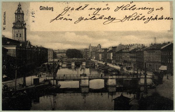 Bilden i sidhuvudet visar ett vykort över centrala Göteborg med en nyårshälsning, hämtat från Göteborgs stadsmuseum, Carlotta.