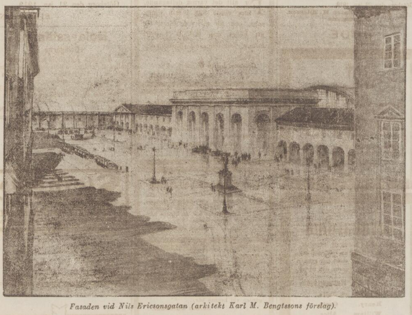Härefter uppträdde arkitekt Karl M. Bengtsson och framhöll säckstationens stora fördelar för de resande ifråga om bekvämlighet m.m. och att den i vår stad var den enda möjliga. Han skärskådade vidare frågan ur estetisk synpunkt och demonstrerade trafikmöjligheterna till och från staden vid Nils Ericsonsgatan. Tal. åberopade för sin ståndpunkt utländska auktoriteter och ansåg att en utredning under alla förhållanden ej borde taga mer än ett år.