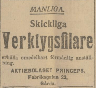 ”Örgrytepolisen har anhållit en 26-årig bokhållare hos A.-B. Princeps i Gårda, vilken gjort sig skyldig till synnerligen omfattande bedrägerier. Sedan slutet av 1917 har den anhållne genom att å arbetarnas avlöningslistor uppföra större belopp än arbetarna sedan erhållit tillnarrat sig över 38,000 kr. Utredningen i saken är ännu icke slutförd, och det uppgives, att det belopp, varpå den anhållne bedragit bolaget kommer att avsevärt överstiga den nämnda summan.