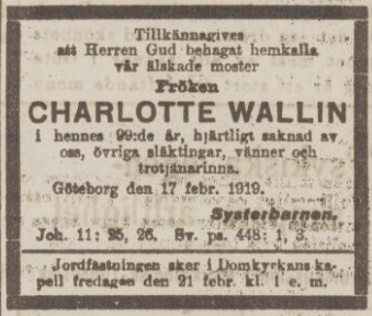Den enda, som levde kvar av de gamla, var Charlotte Wallin, född 1820, död i sitt 99:e år den 17 februari 1919, och alltså en av Göteborgs äldsta innevånare. Under denna långa tid hade hon, med ständigt vaket sinne och in i det sista bevarad intelligens, hunnit att vara med om mycket. Vid den första och svåraste koleraepidemin 1834 stod hon vid flera av sina närståendes dödsbäddar. År 1848 har jag vidrört. Revolutionen ute i världen tog henne då kanske icks å mycket, men inkvartering av officerare, som drogo till Danmark för att deltaga i kriget där, hade fru Wallin haft i sitt hem. Hon beskrev det livligt. Hela sitt liv politiskt intresserad, men konservativ till sin läggning, kom andra franska kejsardömet att livligt slå an på hennes för det lysande öppna sinne. Från den tiden hade hon mottagit och behållit sina starkaste intryck. Hon verkade därför på de yngre som gengångare från en för dem okänd tid. När stadsfullmäktige infördes, var hon ej så sällan med på åhörarläktaren. Hon kände ju så väl till stadens styrande fäder. Efter att en sommar vid slutet av 1850 ha vistats i Danmark, kom hon i beröring med utlänningar och under dansk-tyska kriget tog hon liksom sedan vid de stora krigen med liv och lust del i de politiska händelserna. Hennes allra sista intressen rörde världskriget, framförallt Tyskland, där hon ofta vistades och där hon hade många personliga vänner. Charlotte Wallin hade gott språkhuvud och var på de språk hon behärskade en utmärkt lektrice. Ännu vid 88 års ålder lyssnade man gärna till henne. Lektyren fick dock icke vara modern, även i det fallet var hon konservativ, men tidningarna följde hon med så länge hon såg, och det gjorde hon vid dagsljus nästan in i det sista. En mångårig dövhet avstängde henne dock från mycket, men med sitt briljanta minne, i olikhet mot gamla, även för gårdagen, hade hon lätt att sätta sig in i förhållandena. Ännu på det sista spann hon det finaste garn, och då en fattig beklagade sig över att hon ej kunde få köpa sytråd, tog hon fram sin spinnrock och tvinnade fullt användbar tråd. Några månader före sin död talade hon om, att hon behövde förkovra sig i engelska språket. Sina affärer skötte hon själv och lät, tyvärr, ingen se i sina papper.