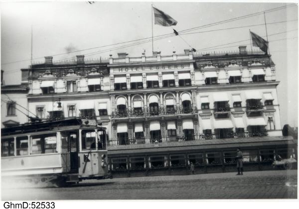 I sidhuvudet visas en bild av en spårvagn som passerar hotell Eggers år 1919, hämtad från Göteborgs stadsmuseum, Carlotta.